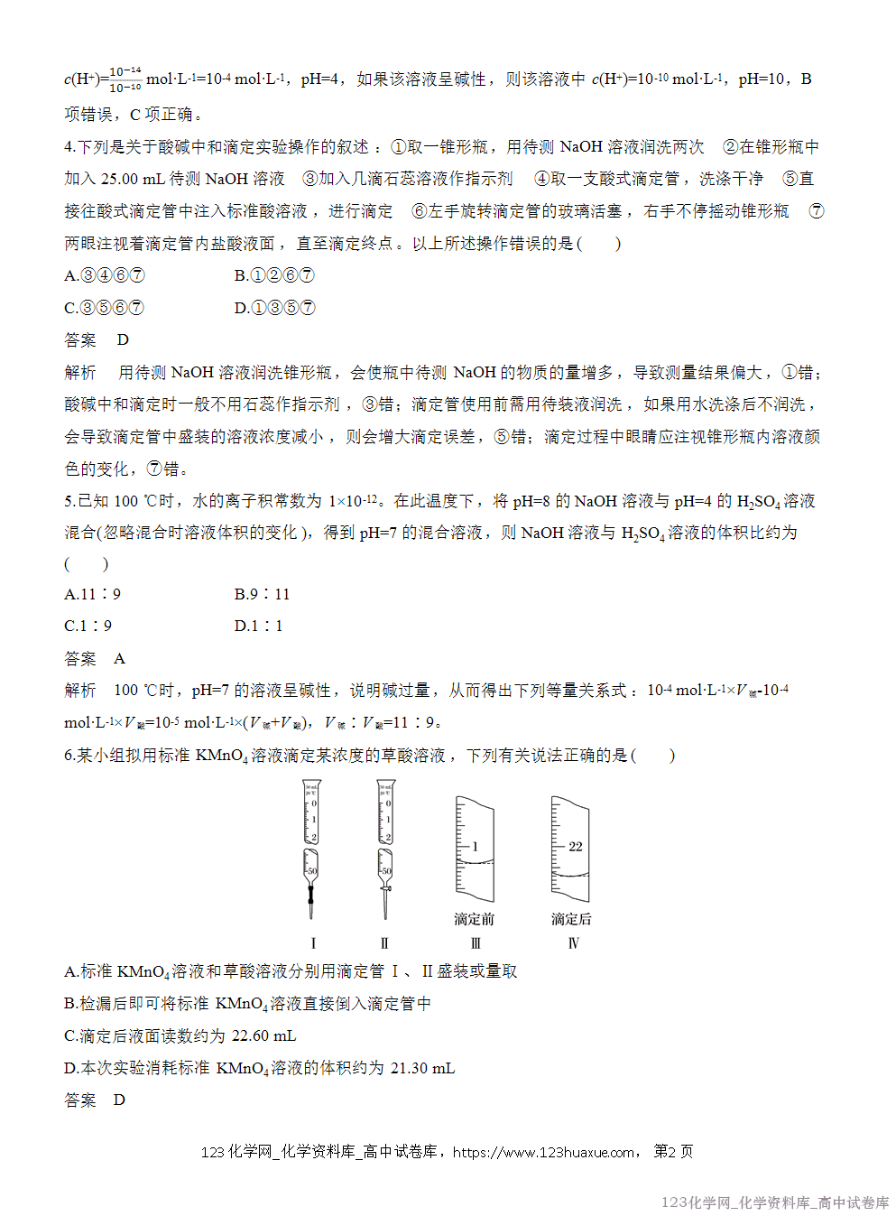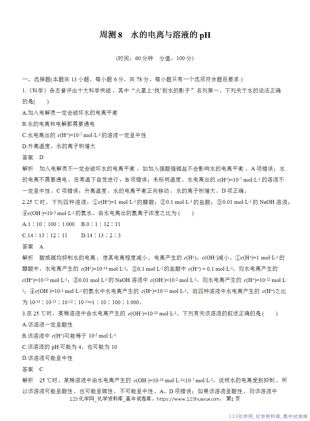 解析 酸或碱均抑制水的电离,使其电离程度减小,电离产生的c(H+)、c(OH-)减小。①c(H+)=1 mol·L-1的醋酸中,水电离产生的c(H+)=10-14 mol·L-1;②0.1 mol·L-1的盐酸中c(H+) = 0.1 mol·L-1,则水电离产生的c(H+)=10-13 mol·L-1;③0.01 mol·L-1的NaOH溶液中c(OH-)=10-2 mol·L-1,则水电离产生的c(H+)=10-12 mol·L-1;④c(OH-)=10-3 mol·L-1的氨水中水电离产生的c(H+)=10-11 mol·L-1,故四种溶液中水电离产生的c(H+)之比为10-14∶10-13∶10-12∶10-11=1∶10∶100∶1 000。