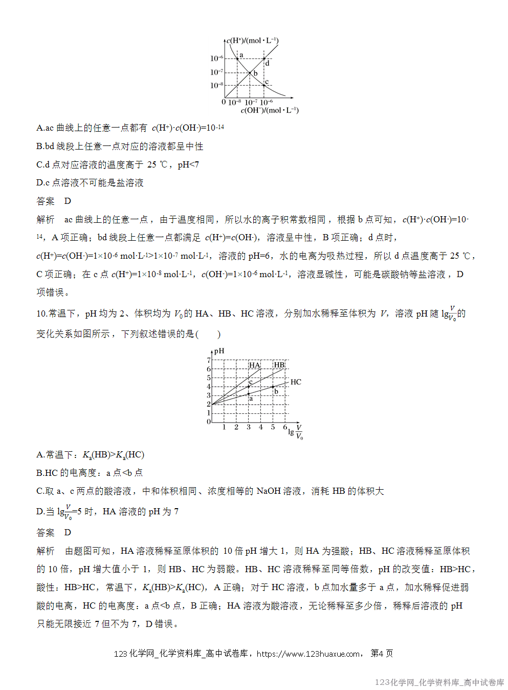 解析 加入电解质不一定会破坏水的电离平衡,如加入强酸强碱盐不会影响水的电离平衡,A项错误;水的电离不需要通电,在常温下自发进行,B项错误;未标明温度,水电离出的c(H+)=10-7 mol·L-1的溶液不一定呈中性,C项错误;升高温度,水的电离平衡正向移动,水的离子积增大,D项正确。