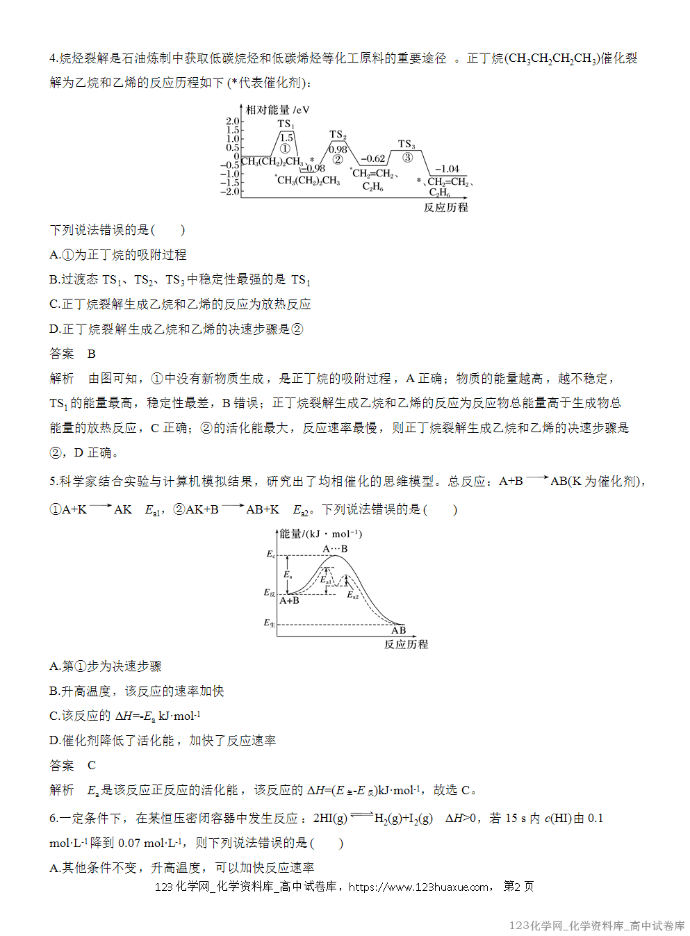 解析 CH3COOH是弱电解质,电离时吸热,故反应热ΔH>-57.3 kJ·mol-1, A错误;根据热化学方程式C6H12O6(s)+3O2(g)===3CO2(g)+3H2O(l) ΔH=-1 400 kJ·mol-1可知C6H12O6(s)+6O2(g)===6CO2(g)+6H2O(l) ΔH=-2 800 kJ·mol-1,葡萄糖的燃烧热是2 800 kJ·mol-1, B正确;Na(l)的焓值比Na(s)的焓值大,在其他反应物和生成物完全一样的情况下,Na(l)反应放热更多,故ΔH1<ΔH2,C正确;由热化学方程式可知,等物质的量的石墨比金刚石的能量低,因此石墨更加稳定,D正确。