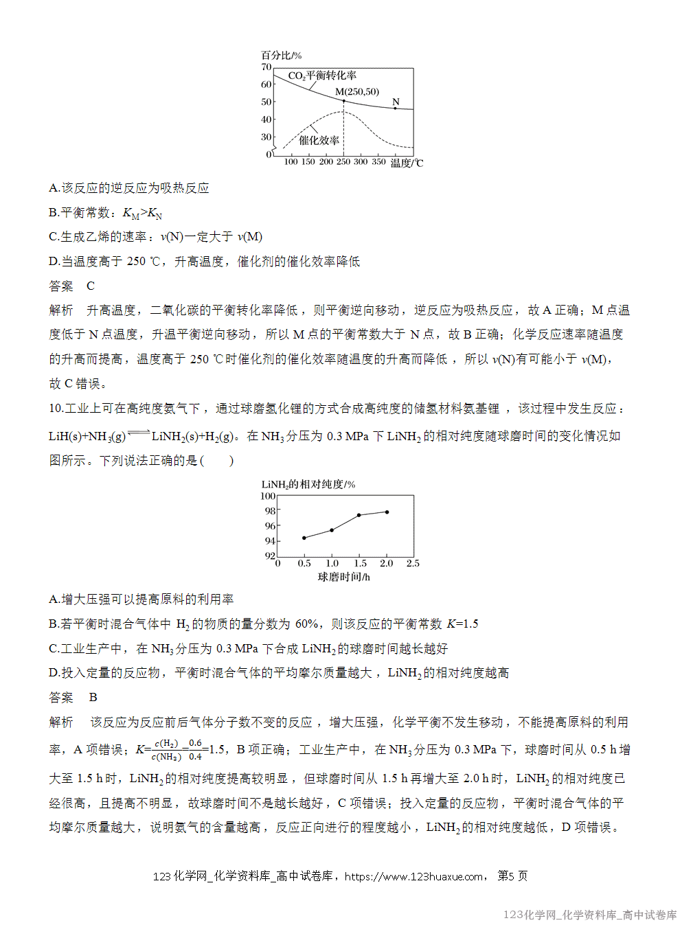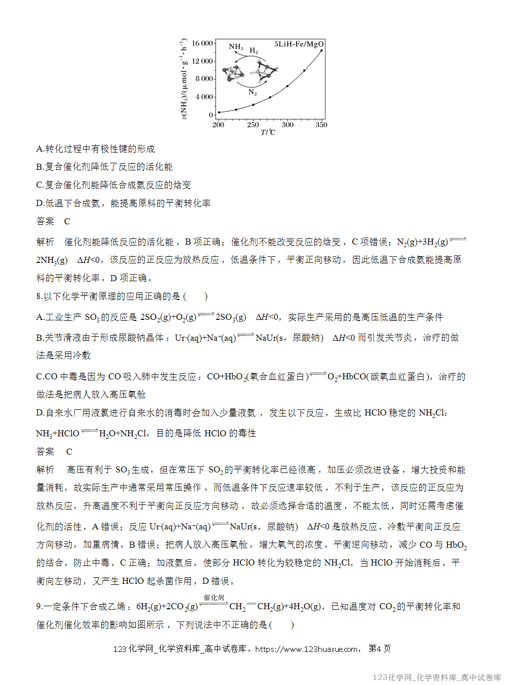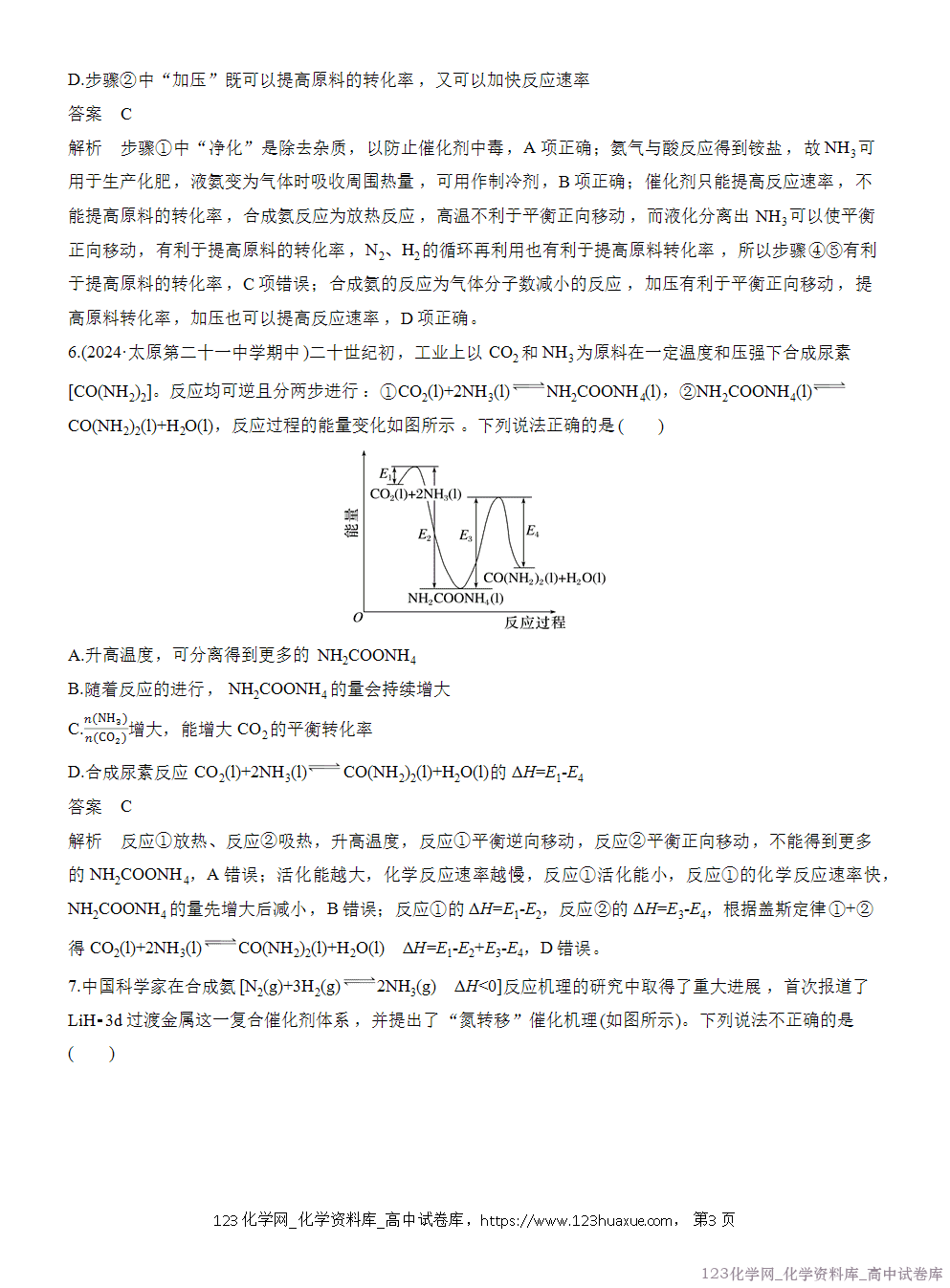解析 理论上氮气越多越好,但充入过多的氮气会造成压强过大,对设备强度的要求更高,而且会影响到产物中氨气的分离,所以充入的氮气不是越多越好,A项错误;恒容条件下充入稀有气体,参与反应的各物质的浓度没有改变,则平衡不移动,对氨气的合成没有影响,B项错误;ΔG=ΔH-TΔS<0时,反应可以自发进行,该反应的ΔH<0、ΔS<0,所以在低温下可自发进行,C项正确;将产生的氨气分离出去,正反应速率瞬间不变,然后慢慢减小,逆反应速率瞬间减小,然后慢慢增大,平衡正向移动,反应物的转化率升高,D项错误。